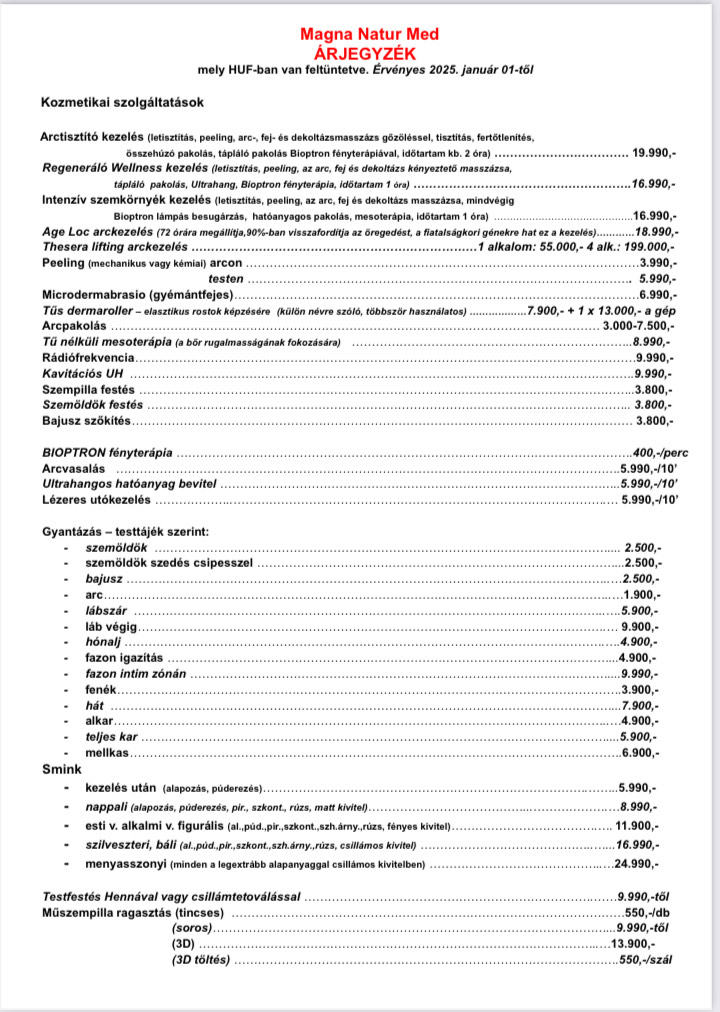 Arctisztító kezelés (letisztítás, peeling, arc-, fej- és dekoltázsmasszázs gőzöléssel, tisztítás, fertőtlenítés, összehúzó pakolás, tápláló pakolás Bioptron fényterápiával v. lézerrel, időtartam kb. 2 óra): 19.990, -